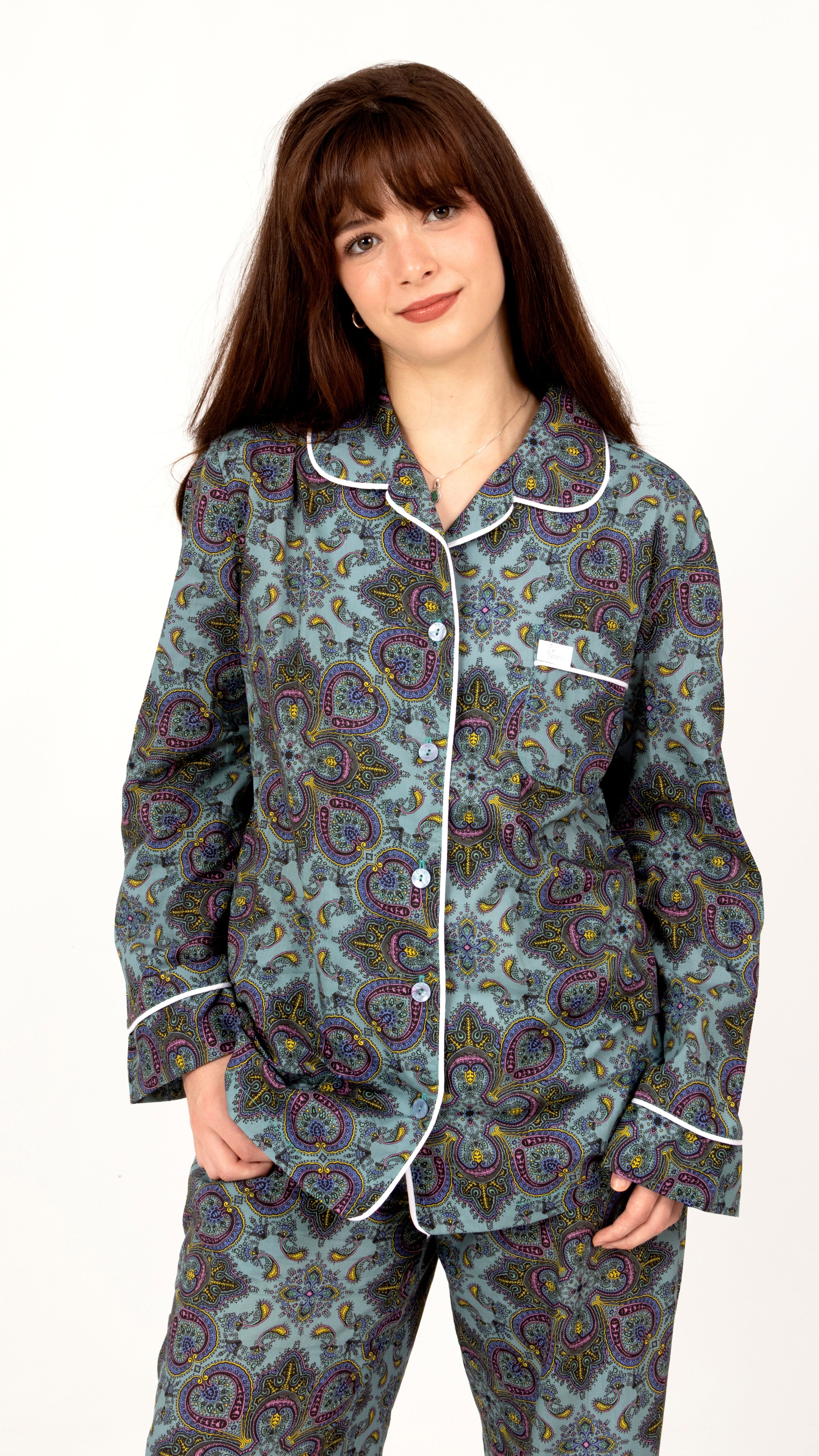 The Elegant Long set features a long-sleeved top and full-length pants, making it your go-to for cooler evenings and winter mornings. The rich texture and limited-crease finish make it as practical as it is luxurious - ideal for your first coffee of the day or a nightcap by the fire.Expertly made from 100% natural Liberty Tana Lawn™ cotton, this set promises both warmth and a silky-smooth touch. It combines comfort and elegance in a way that feels indulgent, yet effortless.