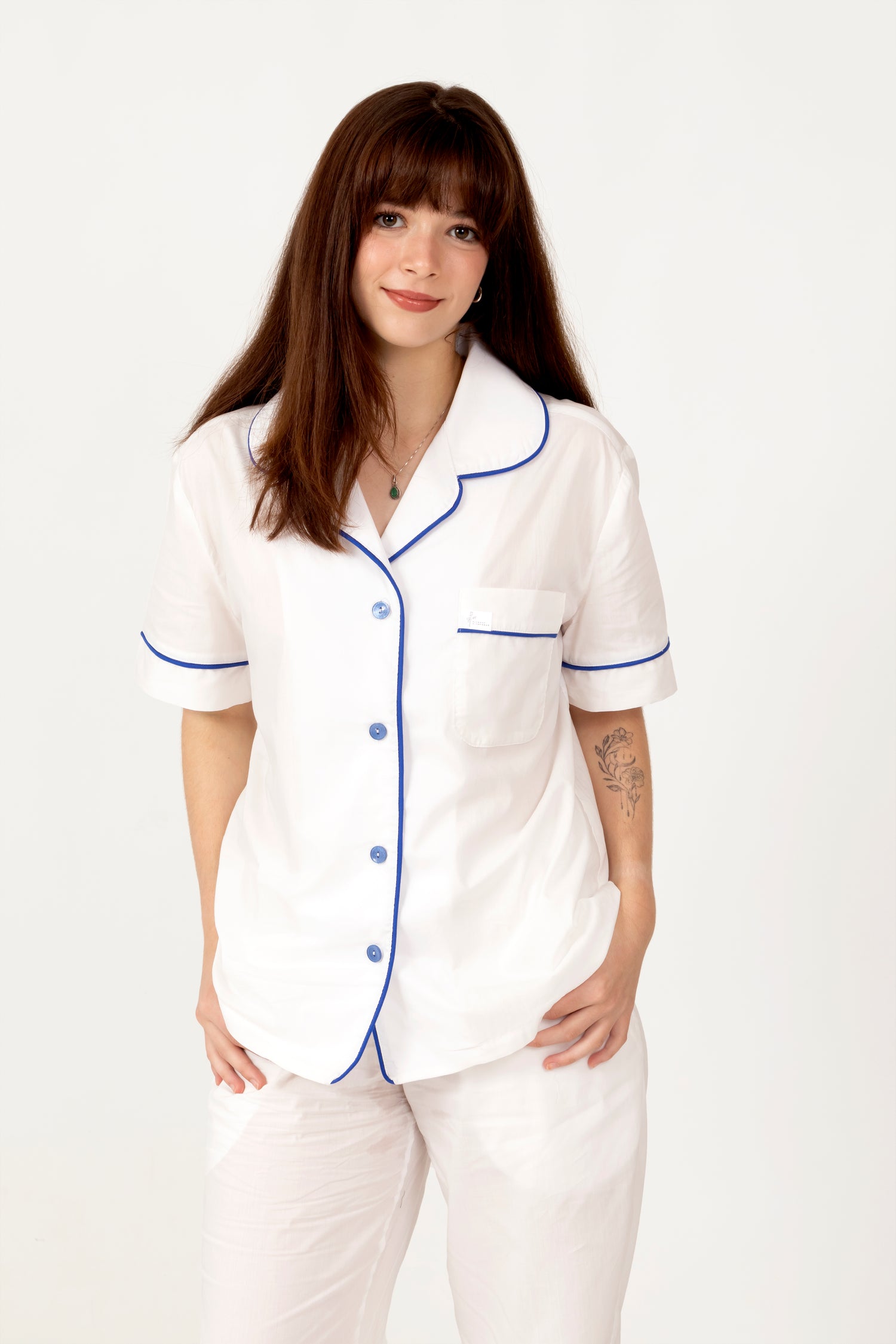 This beautifully tailored short-sleeved top and long-bottom set is ideal for those who prefer more coverage without compromising on comfort or style. It’s perfect for transitional seasons or evenings with a chill in the air.Made from 100% natural Liberty Tana Lawn™ cotton, the set offers a luxuriously smooth fit with exceptional breathability. Its elegant drape and skin-soft feel make it the ultimate companion for evening rituals and quiet, restful nights.